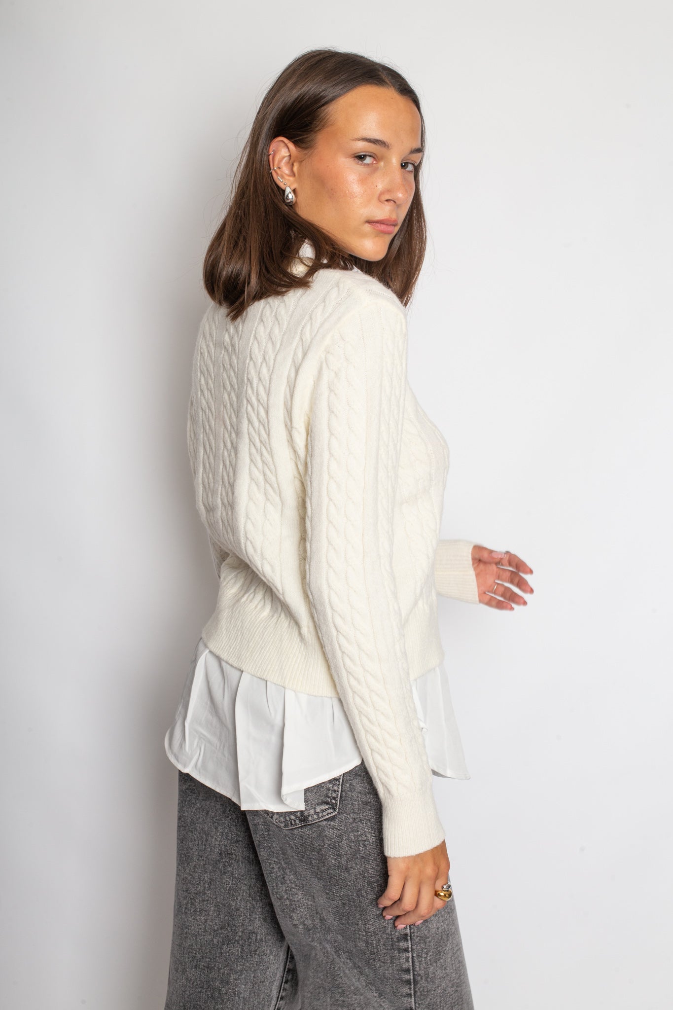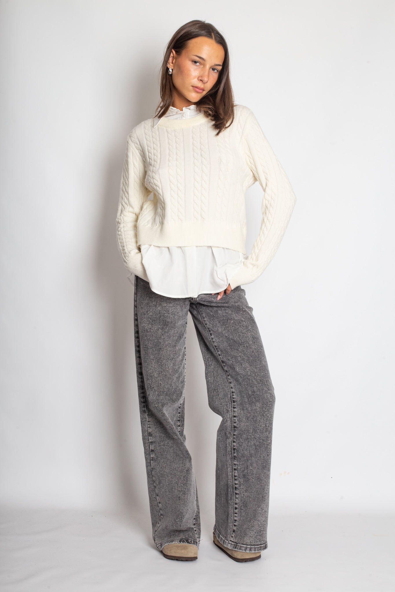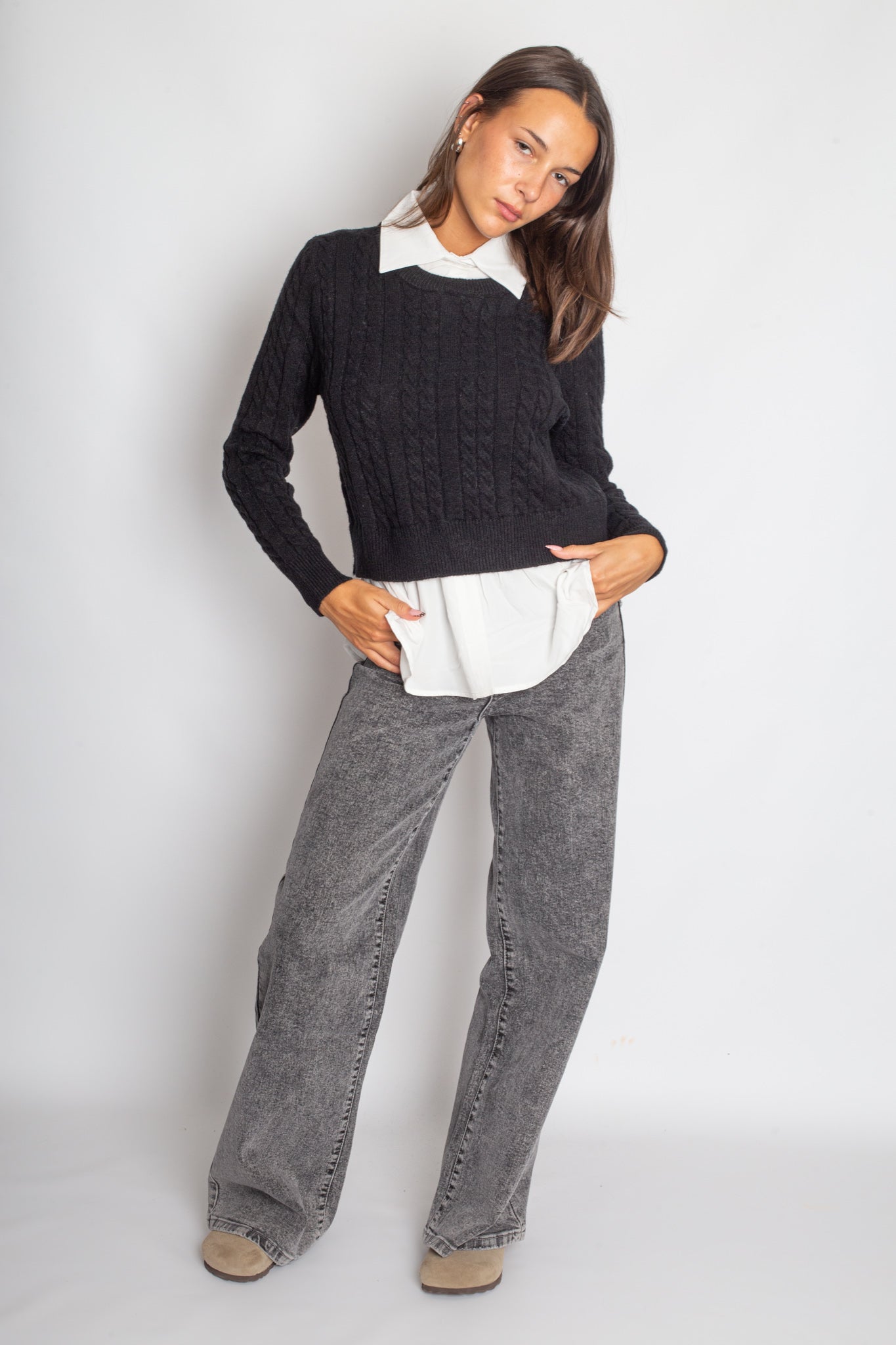 Un basique doux et élégant, parfait pour l’automne-hiver. Ce pull court en maille torsadée se porte aussi bien seul que superposé sur une chemise, comme un effet “layering” déjà stylé. Sa coupe droite et son tricot moelleux apportent chaleur et confort au quotidien.