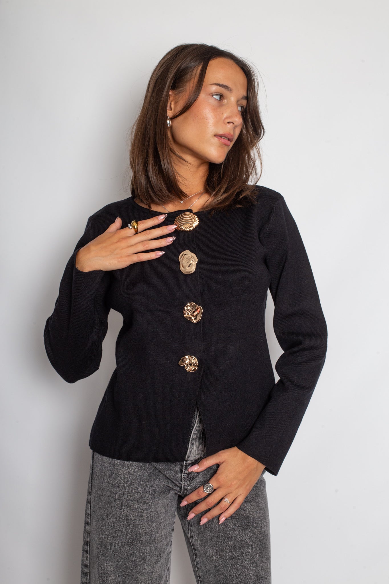 Un gilet élégant qui sublime vos tenues grâce à ses boutons dorés travaillés façon bijoux. Sa maille douce et fluide se pose parfaitement sur la silhouette, tandis que sa coupe droite et son col rond créent une allure raffinée et facile à assortir.