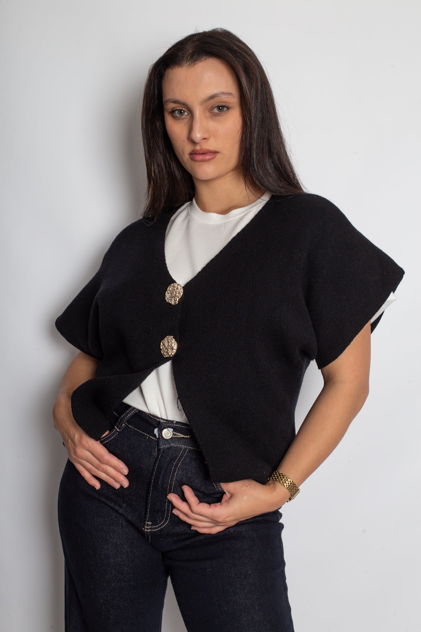 Ce gilet à manches courtes réinvente l’allure casual chic. Sa maille douce et fluide valorise la silhouette tandis que ses boutons bijoux dorés apportent une touche précieuse. Parfait sur un t-shirt ou à même la peau, il se porte aussi bien en ville qu’au bureau.