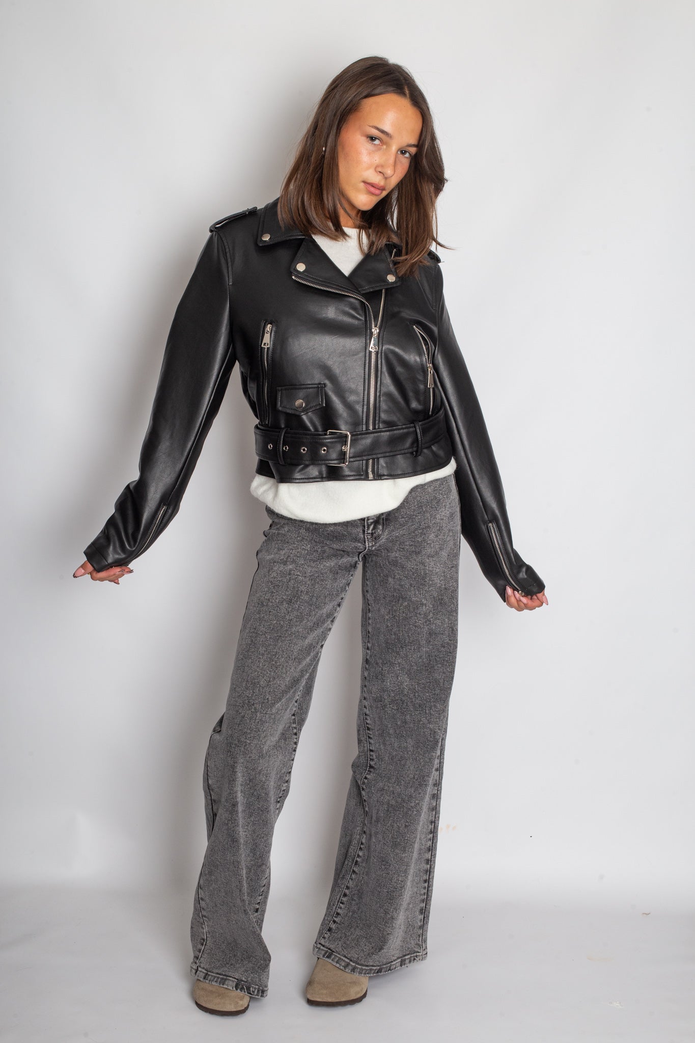 Veste biker noire en simili cuir, coupe droite légèrement oversize pour un style rock et urbain. Détails soignés : col à revers, zips argentés, ceinture ajustable et poches latérales. Parfaite pour donner du caractère à un jean ou une robe, elle reste souple et confortable pour un usage quotidien.